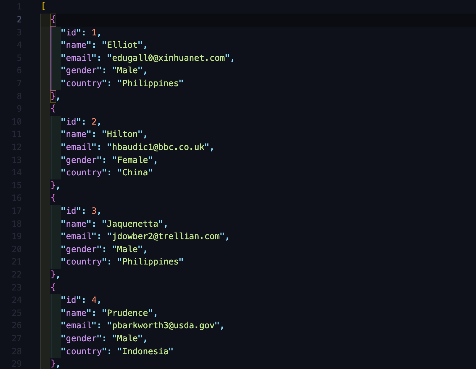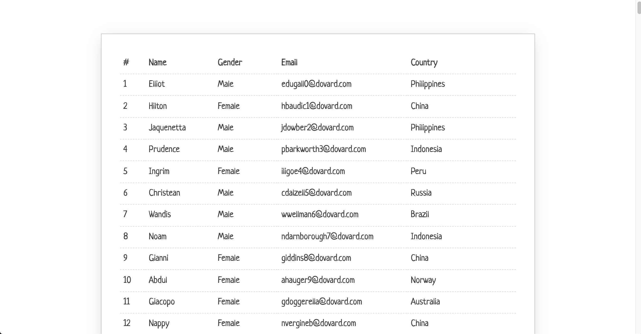 <div class="paper container" style="margin: 10vh auto;"> <table> <thead> <tr> <th>#</th> <th>Name</th> <th>Gender</th> <th>Email</th> <th>Country</th> </tr> </thead> <tbody id="userTbody"></tbody> </table> </div>먼저 스택오버플로우에서 가져온 코드 입력해서 mockData 배열 만들고