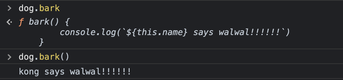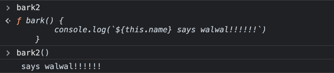 const dog = { name : "kong", age : 2, color : "black", bark() { console.log(`${this.name} says walwal!!!!!!`) } } const bark2 = dog.bark;