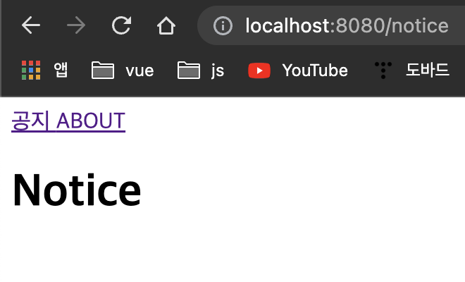 //App.vue <template> <div id="app"> <router-link to="notice"> 공지 </router-link> <router-link to="about"> ABOUT </router-link> <router-view> && </router-view> </div> </template> <script> export default { name: 'App', components: { } } </script>3.Main.js에서