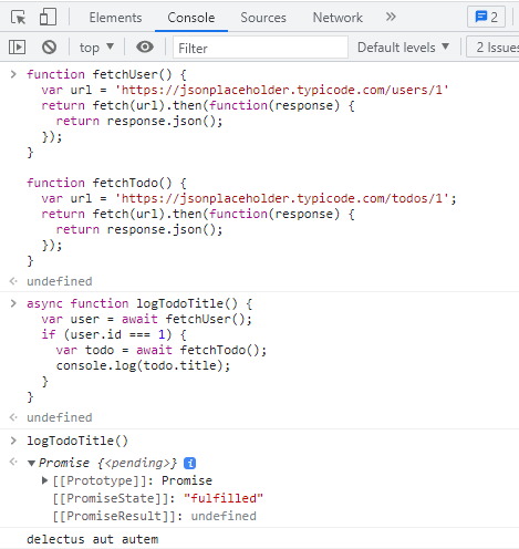 function fetchUser() { const url = 'https://jsonplaceholder.typicode.com/users/1' return fetch(url).then(function(response) { return response.json(); }); } function fetchTodo() { const url = 'https://jsonplaceholder.typicode.com/todos/1' return fetch(url).then(function(response) { return response.json(); }); } async function logTodoTitle() { try { const user = await fetchUser(); if (user.id === 1) { const todo = await fetchTodo(); console.log(todo.title); //user 1 의 todo.title 출력 } } catch(error) { console.log(error); } }