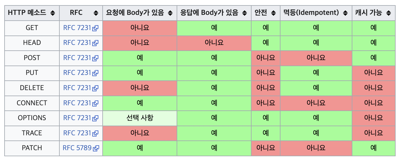 -OPTIONS : 대상 리소스에 대한 통신 가능 옵션(메서드)을 설명(주로 CORS에서 사용)
